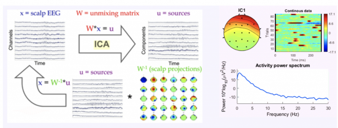 - Blind Source Separation tư tưởng chính của thuật toán là phân tách các tín hiệu EEG ra thành sự kết hợp của các nguồn tín hiệu tuyến tính (linear signal sources). Một trong những thuật toán phổ biến nhất có thể kể đến là ICA (Independent Component Analysis).