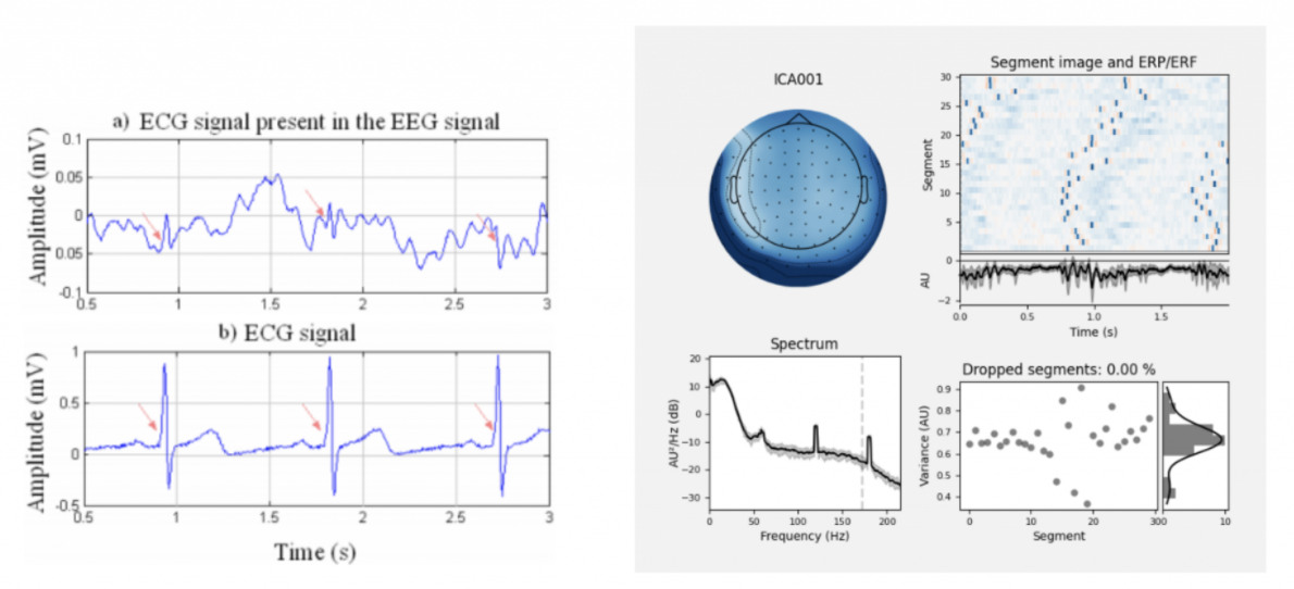 ECG, đúng như tên gọi của nó, chúng bắt nguồn từ những hành động của tim như co bóp gây ra những tín hiệu nhiễu với sóng não. Đặc điểm nhận dạng như các sóng có nhịp lên xuống tuần hoàn tương ứng với heartbeats.