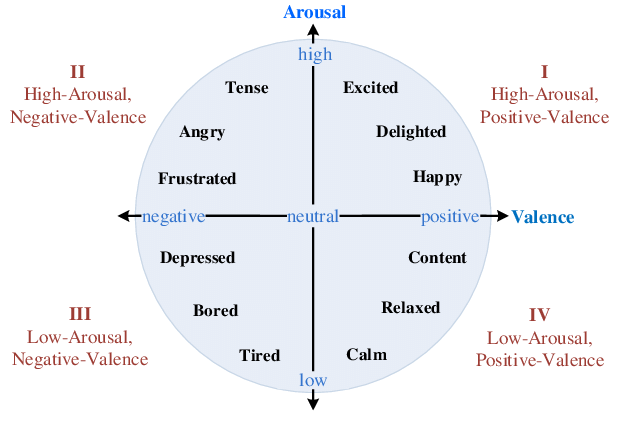 - The dimension model: sẽ là 2 giá trị valence-arousal hoặc 3 valence-arousal-dominance. Trong đó valence biểu thị trạng thái positive or negative, arousal biểu thị mức độ của cảm xúc (vui như thế nào, buồn như thế nào...) và dominance mô tả đang kiểm soát hay bị kiểm soát.