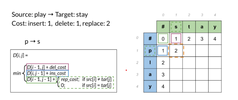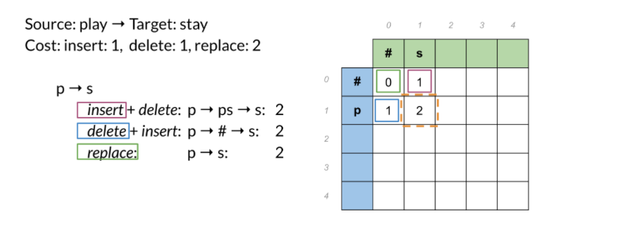 - delete("p") rồi insert("s"), ta nhận được cost = 2
