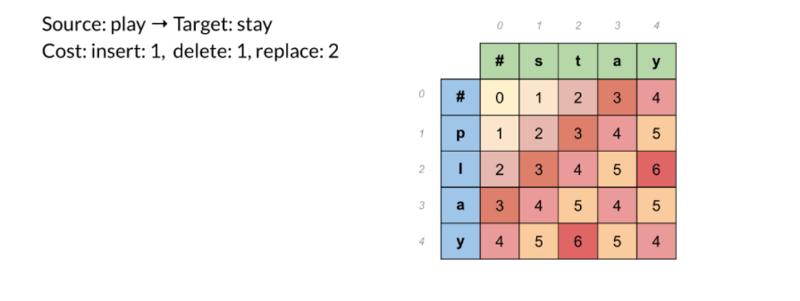 Lưu ý rằng khi các chuỗi của bạn lớn hơn, việc tính toán khoảng cách chỉnh sửa tối thiểu sẽ khó hơn nhiều. Do đó chúng ta sẽ sử dụng dạng bảng để mô tả, Levenshtein distance và thuật toán quy hoạch động để tính toán khoảng cách một cách hiệu quả hơn.