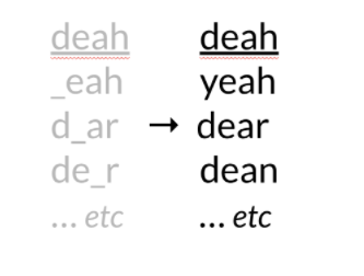 Đây là bước thú vị nhất trong autocorrect. Chúng ta sẽ tìm ra các từ gần giống với từ sai chính tả này nhờ thuật toán Minimum edit distance(lưu ý các từ này có thể là các từ ngẫu nhiên không nhất thiết phải trong từ điển).