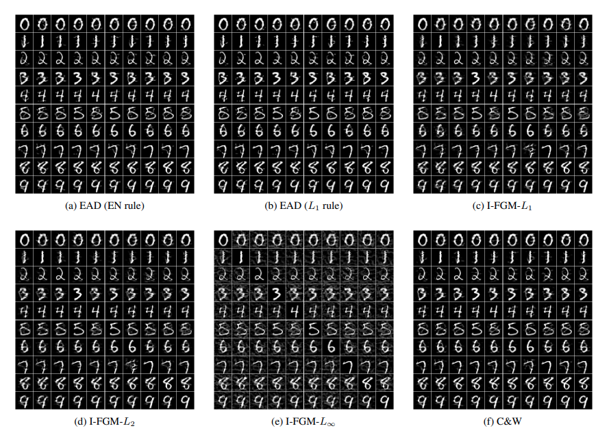 Kết quả cho thấy tấn công này với có tỉ lệ thành công cao (100%!), ngang ngửa với CW và I-FGM (còn có tên là BIM — đây là phiên bản tiền thân của PGD, click vào link này để biết thêm chi tiết). Trong đó, CW cho khoảng cách bé nhất, I-FGM- cho khoảng cách bé nhất, và EAD cho khoảng cách bé nhất. Ngoài ra, các adversarial của EAD nhìn có vẻ giống với ảnh gốc nhất.