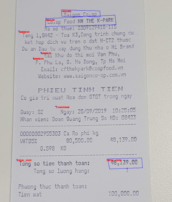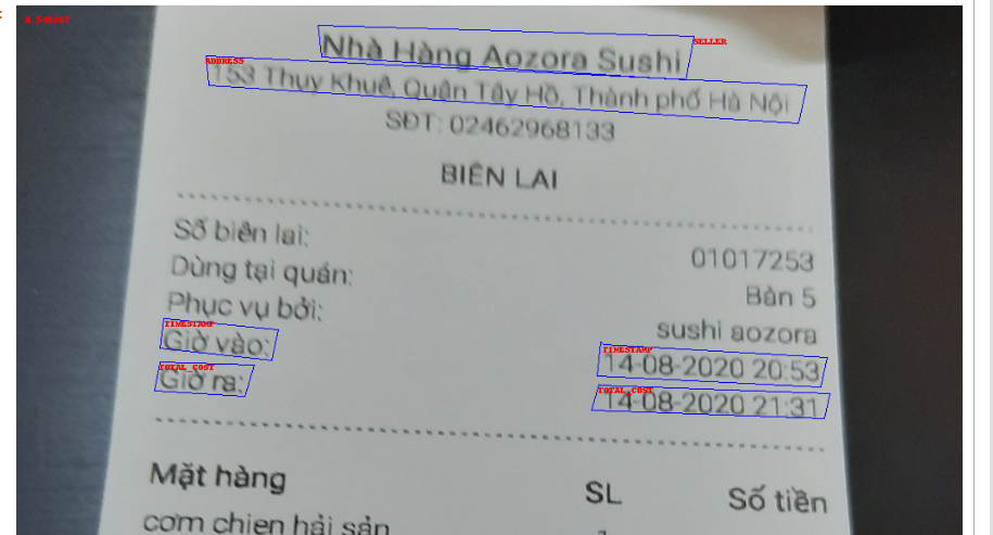 Model này đạt kết quả khá tốt trên tập dữ liệu SROI2019. Lúc đầu bọn mình có thử nghiệm với mô hình này trên bộ dữ liệu hóa đơn nhưng kết quả không tốt có thể do một số label của BTC đưa ra còn sai một số chỗ, mình có visuallize ra đễ xem và phát hiện được mấy lỗi, dưới đây thì mình đưa ra ví dụ 2 lỗi sau: