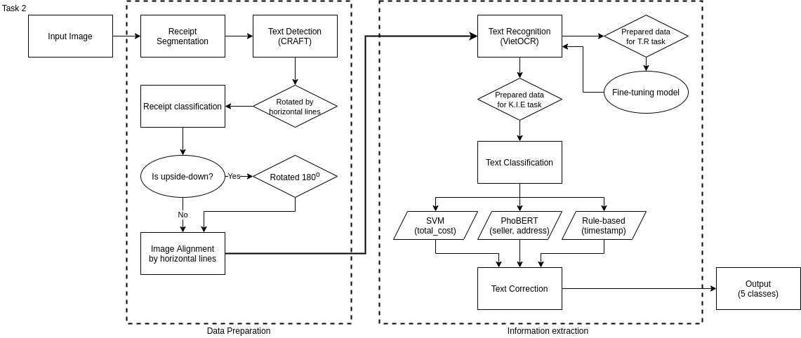Sau đó bọn mình đã lựa chọn dùng mô hình phân loại. Trở thành bài toán phân loại text thành 5 lớp SELLER, SELLER_ADDRESS, TIMESTAMP, TOTAL_COST và OTHER. Sự khó khăn của phương pháp này là label cho nhãn OTHER không được BTC cung cấp và bọn mình đã tự xây dụng tập dữ liệu bằng cách sau: Dùng model CRAFT để nhận được box chứa text, sau đó tính IOU giữa box này và box được BTC label, ngưỡng lớn hơn 0.1 bọn mình sẽ lấy label giống với label của BTC, ngược lại sẽ label cho text đó là OTHER. Từ đó bọn mình có được tập dữ liệu để huấn luyện mô hình phân loại, sau khi phân loại 1 model cho cả 5 lớp thì kết quả cho ra không tốt lắm, nhất là bị nhầm lần rất nhiều giữa tập Other và Total_cost. Sau đó bọn mình đã đưa ra giải pháp sử dụng phân loại theo cụm, theo đó cụm đầu tiên sẽ gốm SELLER, SELLER_ADDRESS và OTHER, cụm thứ 2 chỉ có 2 class là TOTAL_COST và OTHER và về TIMESTAMP mình sử dụng regex. Về cụm thứ 1, gồm các text dài nên mình sử dụng VnCoreNLP+PhoBert cho kết quả khá cao và mình thử nghiệm thì hấu như đều bắt được hết trường SELLER và SELLER_ADDRESS . Cụm thứ 2 mình sử dụng Tf-idf+SVM để phân loại 2 label TOTAL_COST và OTHER vì 2 label này có sự không rõ ràng nên việc đưa mô hình phức tạp như PhoBert không cho kết quả cao, thay vì đó sử dụng SVM cho kết quả tốt hơn. Về TIMESTAMP mình sử dụng regex bắt form ngày tháng năm để tìm ra text chứa những form đó, điều này có thể gây sai khi hóa đơn đấy có nhiều ngày giờ, nhưng phần lớn các hóa đơn được giải quyết.