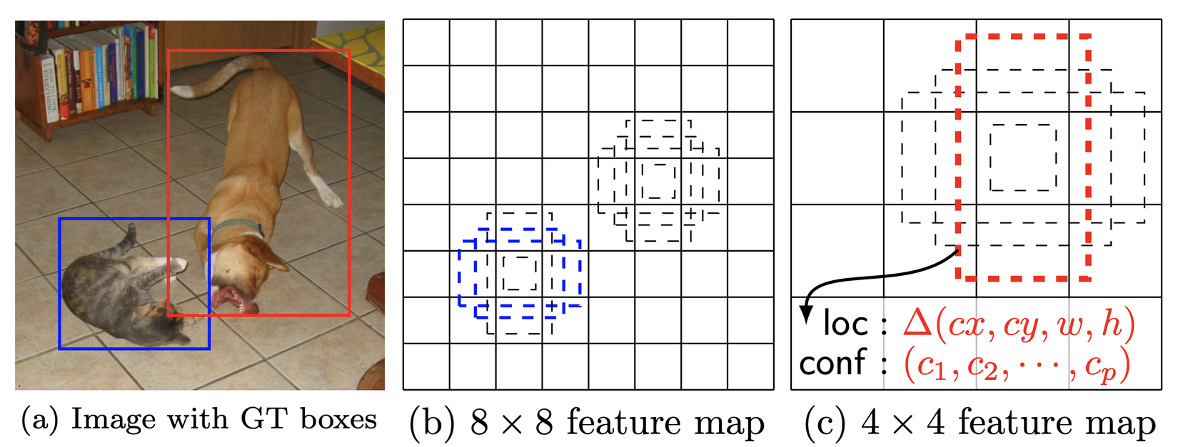Tại mỗi cell trong feature map, với sự xuất hiện của các default boxes này, chúng ta có thể tính toán ra sự sai khác của các predicted locations của object từ các conv_dtec_loc so với các default boxes, và confidence score per-class từ conv_dtec_conf biểu thị sự xuất hiện của 1 class tại mỗi default box đó. Tổng kết lại, giả sử tại ta có k feature maps (mxn) chúng ta sẽ có: (c+4)kmn giá trị predictions.