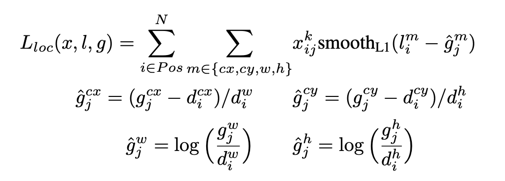 Trong đó, N là số lượng các default boxes matchs với gt_boxes, : predicted boxes, : ground_truth boxes. Confidence Loss và hàm softmax cho multi class, còn Localization Loss được tính như sau (theo paper):