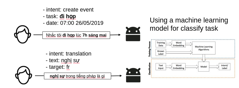 Ví dụ như trong trường hợp dưới đây, người dùng thực hiện 1 lệnh "Nhắc tôi đi họp lúc 7h sáng mai", chúng ta phải biết ý định của người dùng là tạo 1 sự kiện đi họp để báo thức. Còn trong trường hợp dưới, mục đích là dịch từ một câu tiếng Việt sang tiếp Pháp. Việc phân biệt các ý định của người dùng này phải được VoiceBot thực hiện 1 cách nhanh chóng và chính xác.