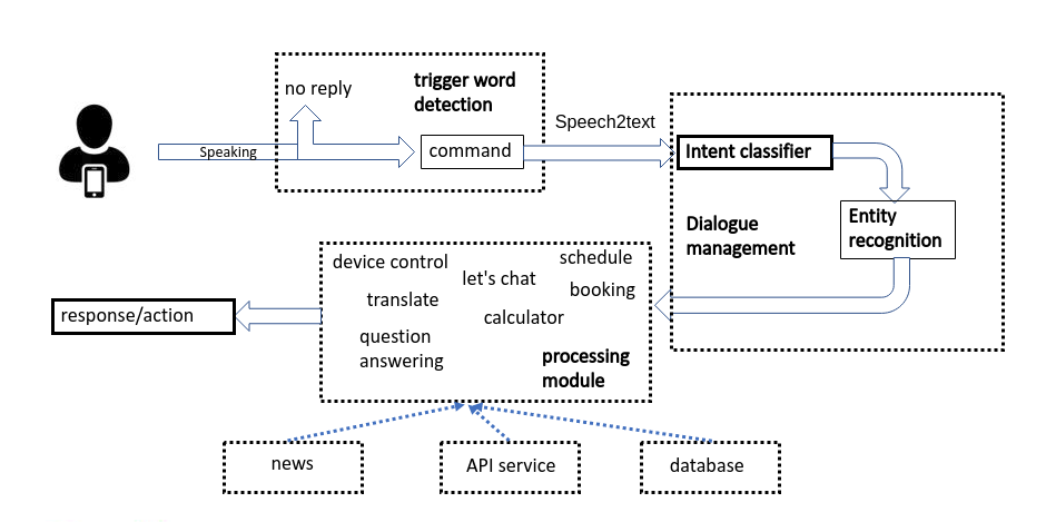 Ban đầu, người dùng thực hiện một lệnh bằng lời nói với thiết bị của chúng ta. Module Trigger word detection sẽ quyết định xem đó có phải là một lệnh hay không. Nếu là một lệnh, lệnh sẽ được chuyển từ âm thanh thành văn bản thông qua Speech2text model. Lệnh sẽ được phân loại theo mục đích và trích chọn ra những thông tin cần thiết để xác định hàng động tiếp theo của trợ lý ảo. Thông tin được quản lý theo các Session. Lệnh được thực hiện tương ứng với mục đích và thông tin hiện có của câu lệnh, nếu chưa có đủ thông tin, hệ thống sẽ phải yêu cầu người dùng bổ sung thêm thông tin. Phản hồi của trợ lý ảo có thể là 1 đoạn âm thanh chứa thông tin được trả về qua model Text2Speech hoặc một hành động như bật tắt đèn, mở điều hòa,...