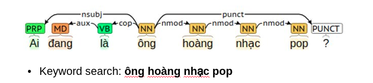 Ví dụ dưới đây là minh họa cho một cây phân tích cú pháp của câu hỏi "Ai đang là ông hoàng nhạc Pop", sau khi phân tích cây cú pháp, chúng ta xác định được keyword để tìm kiếm câu trả lời chính xác hơn.