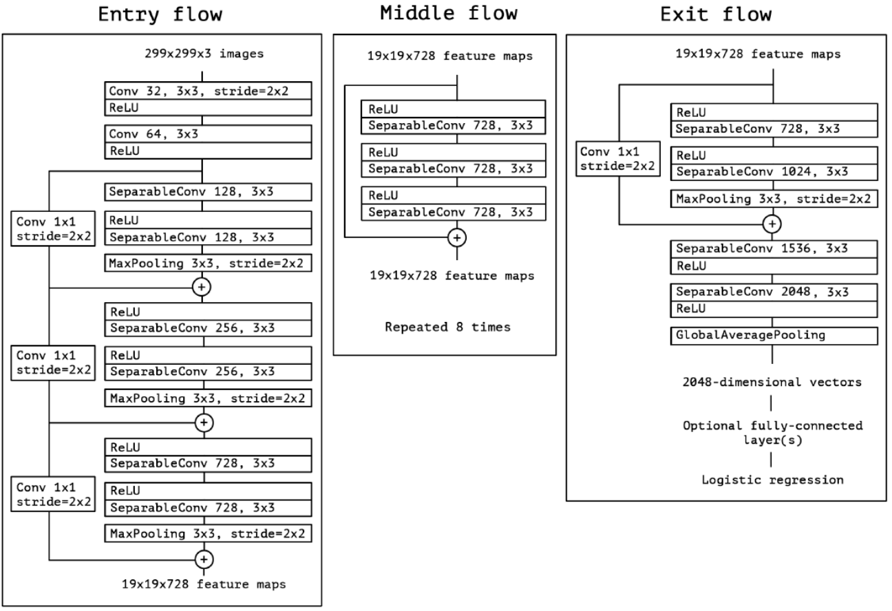 Dưới đây là ví dụ về kiểu kiến trúc XceptionNet: