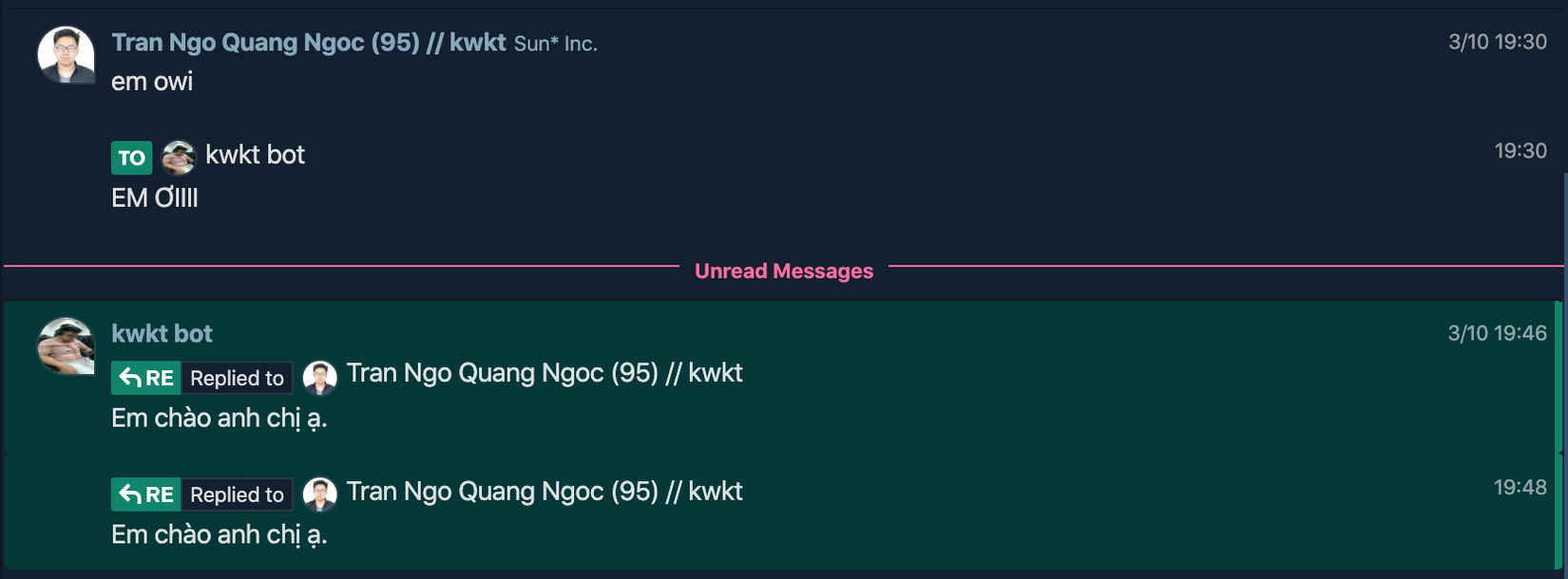 Chưa kể việc Chatwork đổi theme làm mù mắt tôi đi, thì Chatwork webhook nhiều lúc chạy vô cùng dở. Điển hình là việc mình đã thử gửi một tin nhắn và đến 5' sau thì Rasa mới nhận là đến