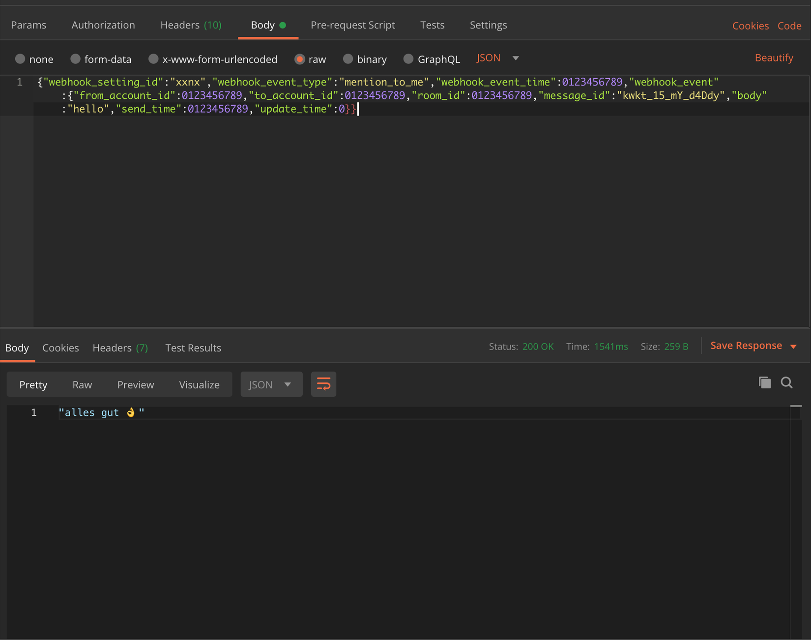 Đừng lo, bạn sẽ không thể bị hack như thế này ngoài đời thật đâu, vì Chatwork yêu cầu HTTPS nên sẽ không thể có Man-in-the-Middle (MITM) attack như mình đang làm bây giờ. Bật Postman lên và gửi vào webhook URL -- nhớ bao gồm cả header để tin nhắn của bạn được validate nhé: