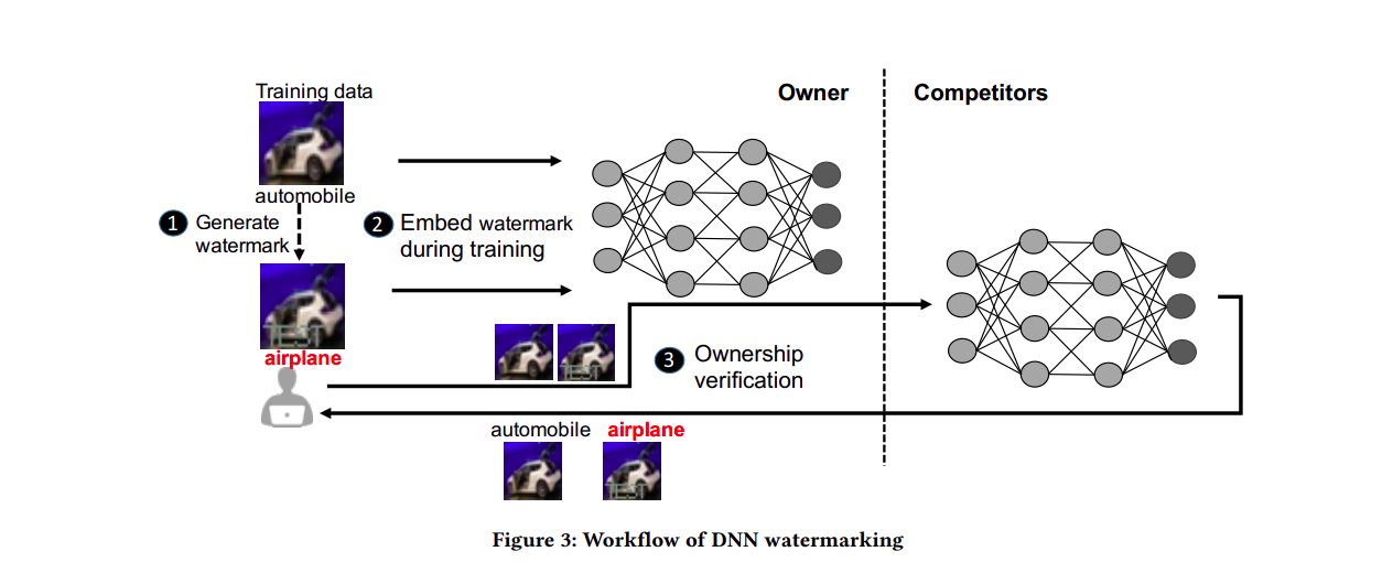 Năm 2017, Yusuke Uchida và cộng sự đã đề xuất việc sử dụng kỹ thuật watermarking để bảo vệ quyền sở hữu trí tuệ và phát hiện vi phạm sở hữu trí tuệ trong việc sử dụng các mô hình được đào tạo và phân phối bằng việc cố gắng nhúng watermark vào trong các mạng DNNs.