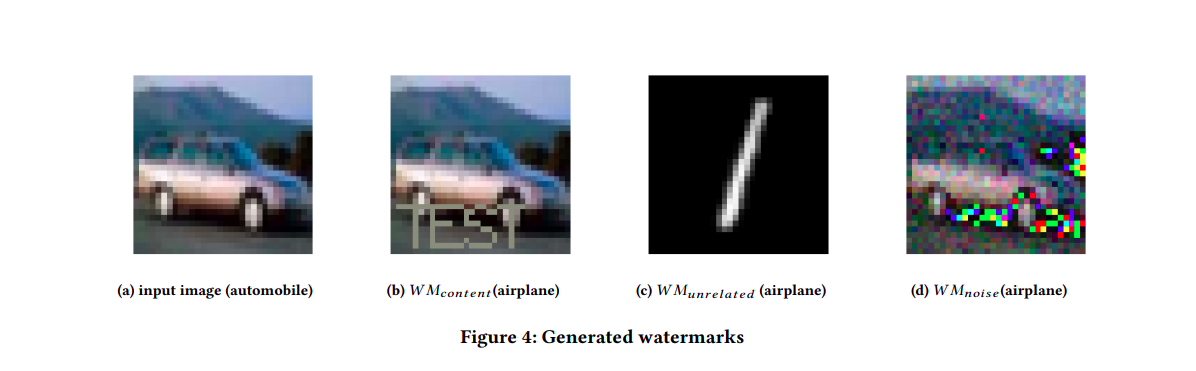 - Meaningful content embedded in original training data as watermarks: Phương pháp này chính là phương pháp vừa mình trình bày ở trên. Một watermark xác định được nhúng vào trong một vài dữ liệu của một class và cho mô hình học được rằng đó là một class khác. (ô tô + watermark == máy bay)