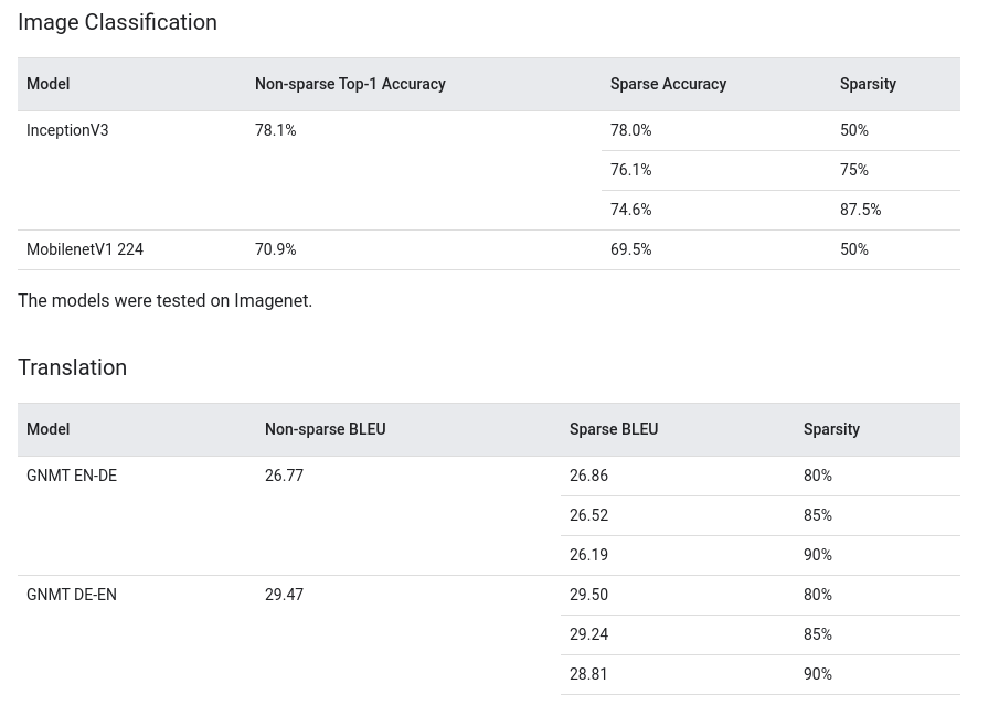 TensorFlow Model Optimization Toolkit là một toolkit được phát triển bởi chính đội ngũ phát triển TensorFlow framework. Bạn có thể dễ dàng đọc được các hướng dẫn về Weight pruning ở đây cũng như Quantization một cách rất chi tiết. Bạn có thể dễ dàng nhìn thấy các kết quả đáng kinh ngạc khi áp dụng Weight pruning tại đây(không lại bảo mình chém).