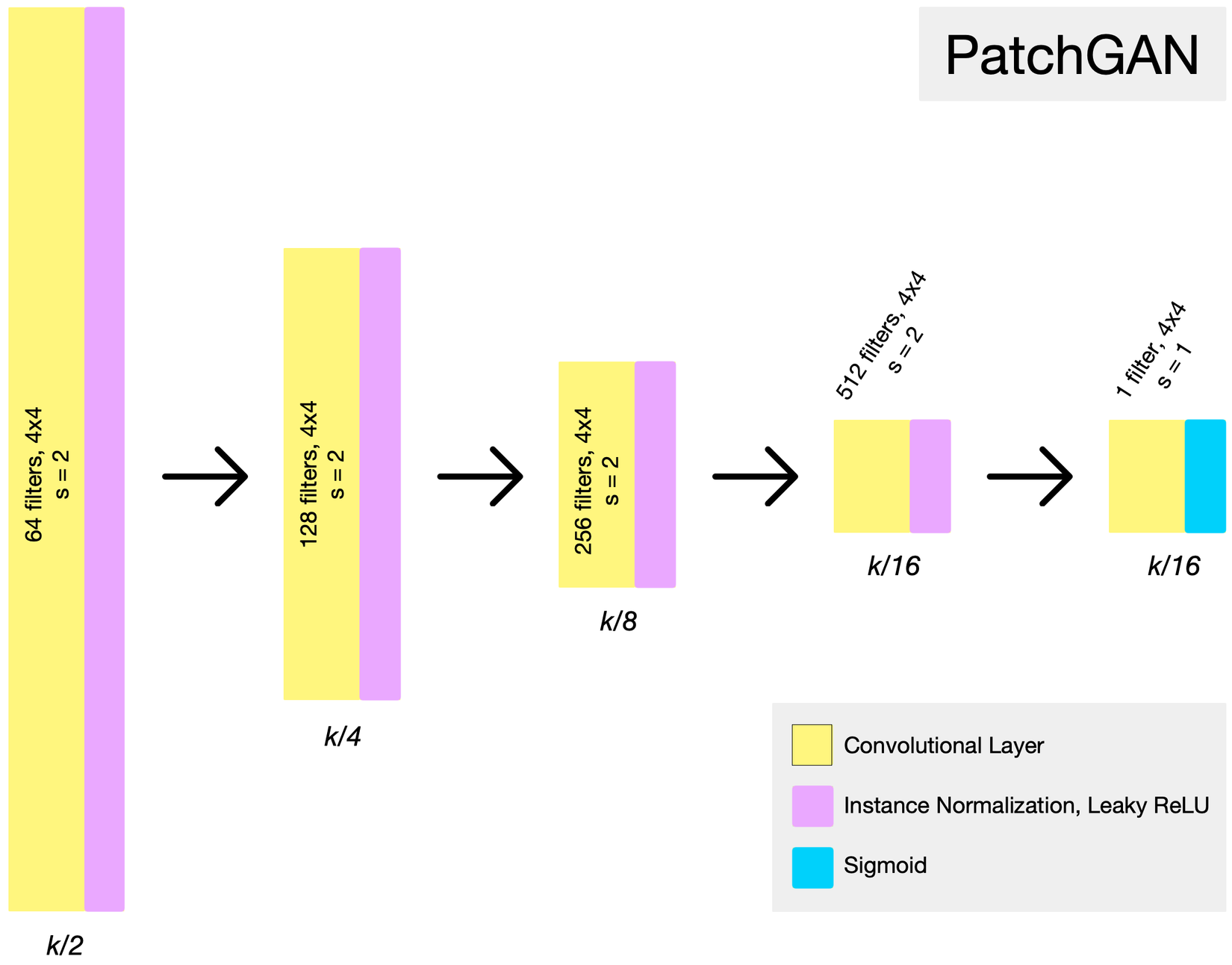 Discriminator sử dụng kiến trúc PatchGAN. Thông thường trong bài toán classification, output của mạng sẽ là một giá trị scalar - xác suất thuộc class nào đó. Trong mô hình CycleGAN, tác giả thiết kế Discriminator sao cho output của nó là một feature map .  Có thể xem là Discriminator sẽ chia ảnh đầu vào thành 1 lưới  và giá trị tại mỗi vùng trên lưới sẽ là xác suất để vùng tương ứng trên ảnh là thật hay giả.