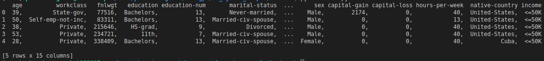 features = ["age", "workclass", "fnlwgt", "education", "education-num", "marital-status", "occupation", "relationship", "race" , "sex", "capital-gain", "capital-loss", "hours-per-week", "native-country", "income"]