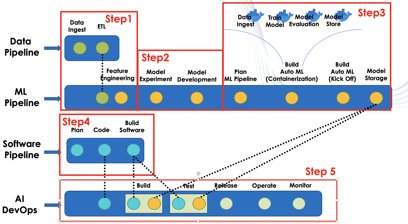 Hình dưới tôi mới chôm đc đâu đó trên google, show cho chúng ta thấy quy trình trong AI DevOps. Ở đây việc xử lý data trở thành 1 pipeline riêng bao gồm từ việc crawl, store, pre-processing, change format, v.v... Dữ liệu từ Data Pipeline sẽ trở thành đầu vào của ML Pipeline để train, evaluation, lưu mô hình hoặc lưu weight (tùy framework mà có các định dạng khác nhau như .npy, .h5, .pb, ...), sau đó cả Data Pipeline và ML Pipeline đều được đóng gói lại bằng Docker. Còn lại Software Pipeline và AI DevOps, là công đoạn ghép mô hình vào sản phẩm.