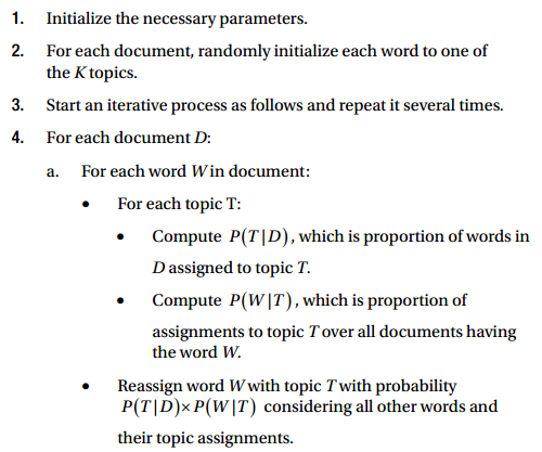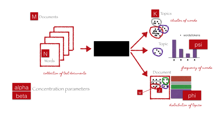 Black box trong hình trên biểu diễn thuật toán cốt lõi sử dụng các tham số đã đề cập trước đó để trích xuất chủ đề K của dữ liệu M. Các bước sau đây sẽ giải thích đơn giản nhất về các bước diễn ra.