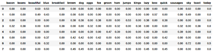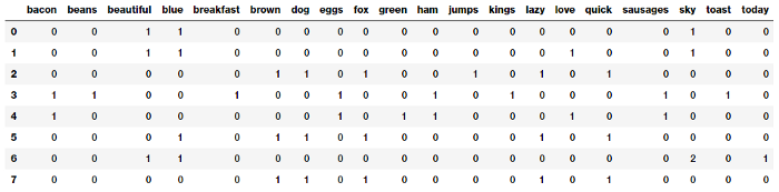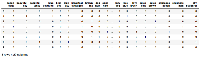 Như kết quả trên bạn có thể thấy rằng các văn bản của chúng ta đã được chuyển đổi thành các vecto số sao cho mỗi mẫu đầu vào đã được biểu diễn bằng một vecto (hàng) trong một ma trận đặc trưng. Đoạn source code sau đây có thể giúp bạn hiểu rõ hơn cách biểu diễn này: