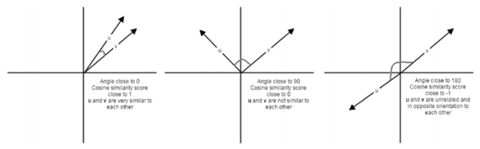 Về cơ bản, khoảng cách cosin cung cấp cho chúng ta một số liệu biểu thị góc giữa 2 vecto đặc trưng tương ứng của từng mẫu. Góc giữa hai mẫu càng gần nhau thì độ tương tự của hai mẫu đó càng lớn như được mô tả trong hình dưới đây