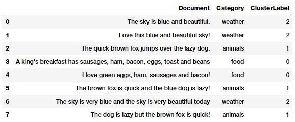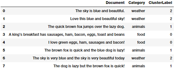 Nhìn vào ma trận độ tương tự (similarity matrix) các bạn có thể thấy rõ ràng rằng các mẫu (0, 1 và 6), (2, 5 và 7) rất giống nhau và các mẫu (3 và 4) hơi giống nhau nhưng cường độ không mạnh lắm. Điều này chỉ ra rằng các mẫu đó một số đặc trưng tương tự nhau. Đây chính là một ví dụ hoàn hảo về việc nhóm hoặc phân cụm văn bản có thể giải quyết được bằng cách học không giám sát (unsupervised learning). Đặc biệt chúng có thể áp dụng xử lý trên khối lượng lớn mẫu văn bản.