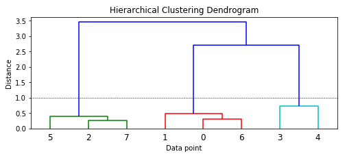 Bạn có thể thấy rằng mỗi điểm dữ liệu ban đầu đều thuộc các cụm riêng lẻ và sẽ được hợp nhất với các điểm dữ liệu khcas để tạo thành cụm. Từ màu sắc và sự phân nhánh bạn có thể thấy rằng mô hình đã xác định được ba cụm chính nếu bạn sử dụng một thước đo khoảng cách từ 1.0 trở lên (trong biểu đồ là đường chấm đứt). Sử dụng khoảng cách này chúng ta sẽ có nhãn của các cụm bằng cách sau.