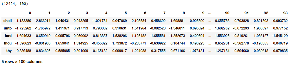 Các bạn có thể thấy một cách khá rõ ràng, với mỗi từ ta sẽ có một vectơ embedding kích thước 1 * 100 đúng với mô tả output trước đó. Bây giờ hãy thử tìm kiếm một số từ có ngữ cảnh tương tự nhau với một vài từ cho trước dựa trên các vectơ embedding này. Để làm được điều đó, chúng ta sẽ xây dựng một ma trận khoảng cách theo từng cặp từ trong tập hợp từ vựng đã có sau đó tìm ra k "hàng xóm" gần nhất của từ đó dựa trên khoảng cách euclidean.