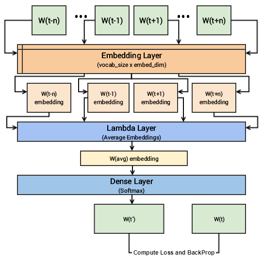 Có lẽ đến đây các bạn vẫn sẽ khó khăn trong việc tưởng tượng ra mô hình deep learning ở trên, các bạn nên đọc kỹ hơn bài báo đã được nhắc tới ở phần trên bài viết này để hiểu sâu hơn về nó. Bây giờ chúng ta sẽ cố gắng tổng hợp lại những điều cốt lõi một cách đơn giản nhất! Các bạn có các ngữ cảnh đầu vào với kích thước là 2 * window_size, chúng ta sẽ cho chúng đi qua một embedding layer có kích thước là vocab_size x embed_size và chúng ta sẽ thu được các dense word embedding có kích thước là 1 * embed_size cho mỗi từ trong tập ngữ cảnh. Tiếp theo sử dụng một lambda layer để lấy ra trung bình  của các dense embedding  và cuối cùng là dense layer với activation function softmax để dự đoán giá trị của target_word. Chúng ta so sánh giá trị này với giá trị target_word thực tế để tính toán loss và thực hiện việc điều chỉnh trọng số. Mô hình dưới đây sẽ mô tả các bước trên.