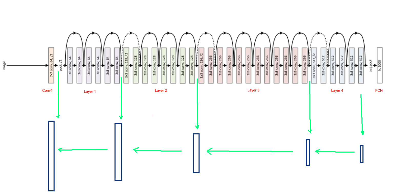 Để giải quyết bài toán, mình sẽ xây dựng model Unet với backbone là Resnet50. Bạn nên tìm hiểu về Resnet nếu chưa biết về kiến trúc này. Hãy quan sát hình minh hoạ dưới đây. Resnet50 được chia thành các khối lớn [Conv1, layer1, layer2, layer3, layer4, FCN] . Unet được xây dựng với Encoder là Resnet50. Ta sẽ lấy ra output của từng khối, tạo các skip-connection kết nối từ Encoder sang Decoder. Decoder được xây dựng bởi các Convolution Transpose layer (xen kẽ trong đó là các lớp Convolution nhằm mục đích giảm số chanel của feature map -> giảm số lượng weight cho model).