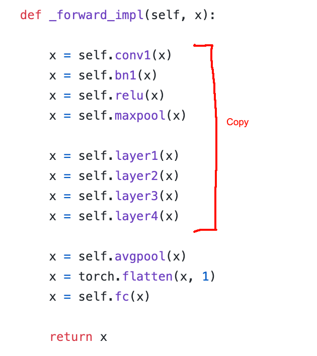 Trong pytorch thì ngược lại, bạn cần hiểu được luồng xử lý và copy code những layer muốn giữ lại trong model mới. Hình trên là code của resnet50 trong torchvision. Bạn có thể tham khảo link: torchvision-resnet50. Như vậy khi xây dựng Unet như kiến trúc đã mô tả bên trên, ta cần đảm bảo đoạn code từ Conv1 -> Layer4 không bị thay đổi. Hãy đọc phần tiếp theo để hiểu rõ hơn.