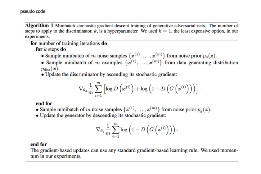 Dưới đây là pseudo code minh họa thuật toán. Trong 2 bài viết tiếp theo mình sẽ viết bài hướng dẫn code 2 ứng dụng GAN đơn giản: sinh ảnh chữ viết tay (dựa trên tập mnist) và sinh ra khuôn mặt nhân vật Anime: