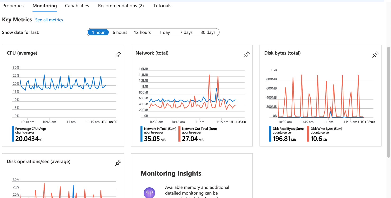 Thông thường khi mua VPS thì ta có thể xem được 1 số thông tin tổng quát về CPU, Ram, networks, có thể xem trực tiếp trên giao diện trang web quản trị của nhà cung cấp nơi ta mua VPS (bên dưới là dashboard cho VM - Virtual Machine của mình trên Azure)