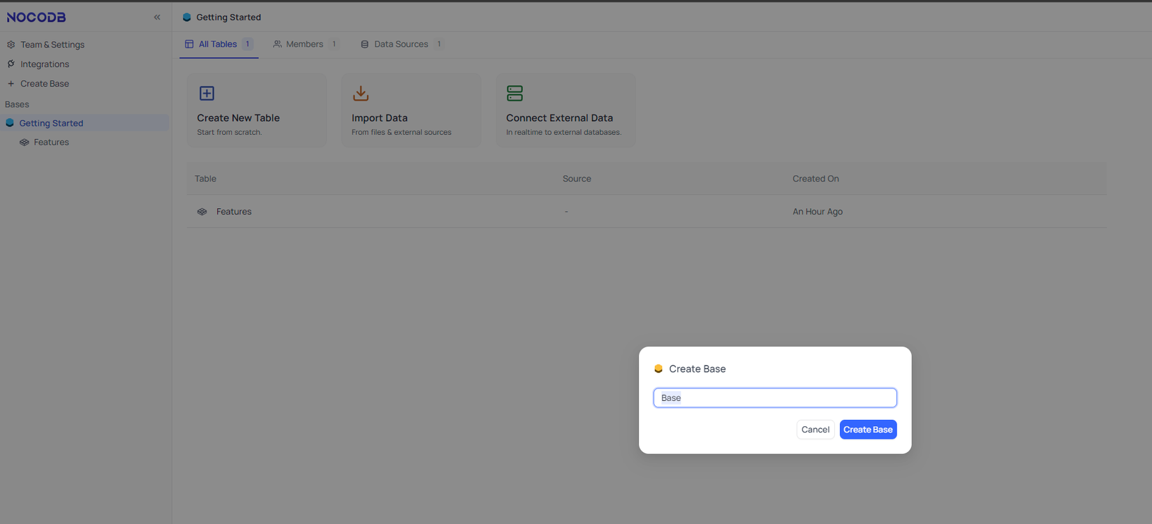 Với các dự án khác nhau, bạn sẽ cần tạo cơ sở dữ liệu khác nhau. Vì vậy trước tiên, bạn cần tạo Base. Nhấn vào Create Base.