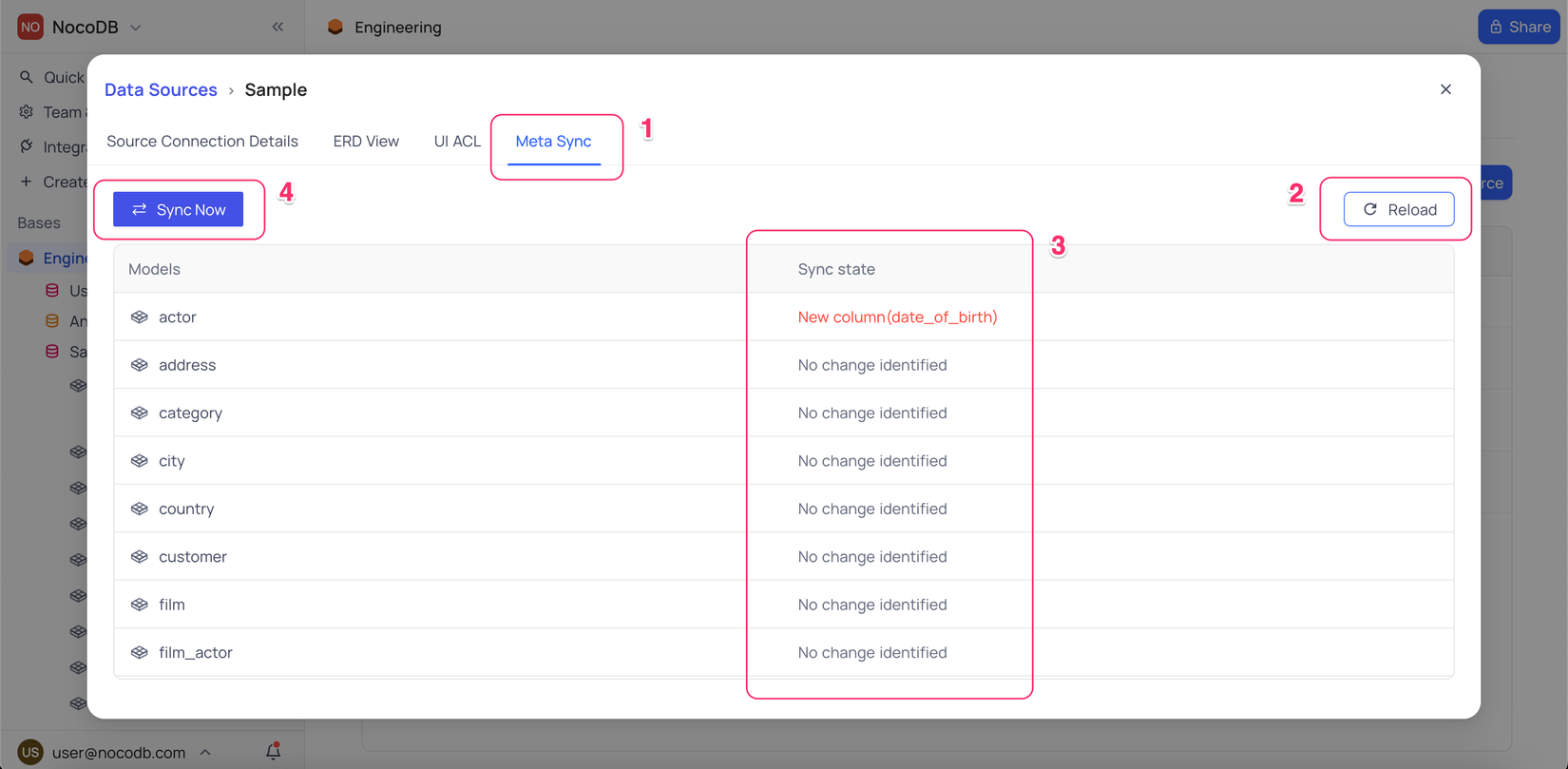 Có một chức năng quan trọng trong mục này là chức năng Sync - đồng bộ dữ liệu giữa NocoDB và cơ sở dữ liệu có sẵn.