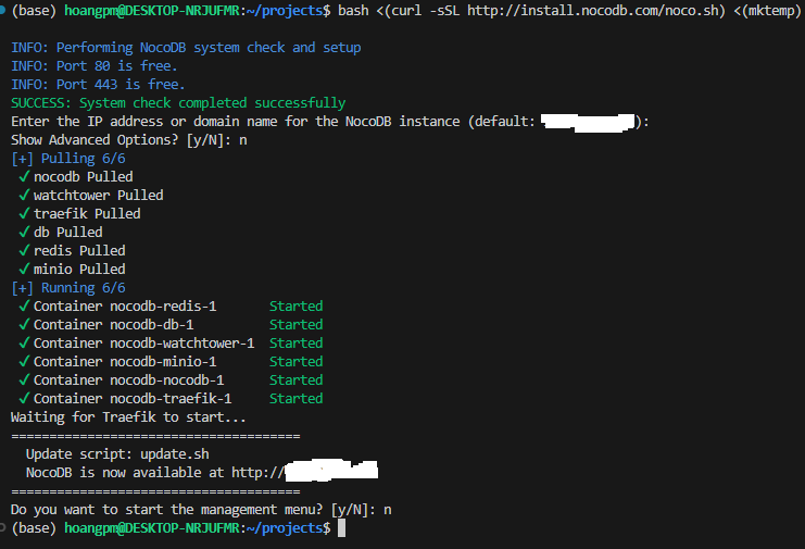 - Sau khi cài đặt xong NocoDB sẽ yêu cầu bạn điền địa chỉ ip/domain cho NocoDB instance. Mặc định là địa chỉ ip của máy bạn