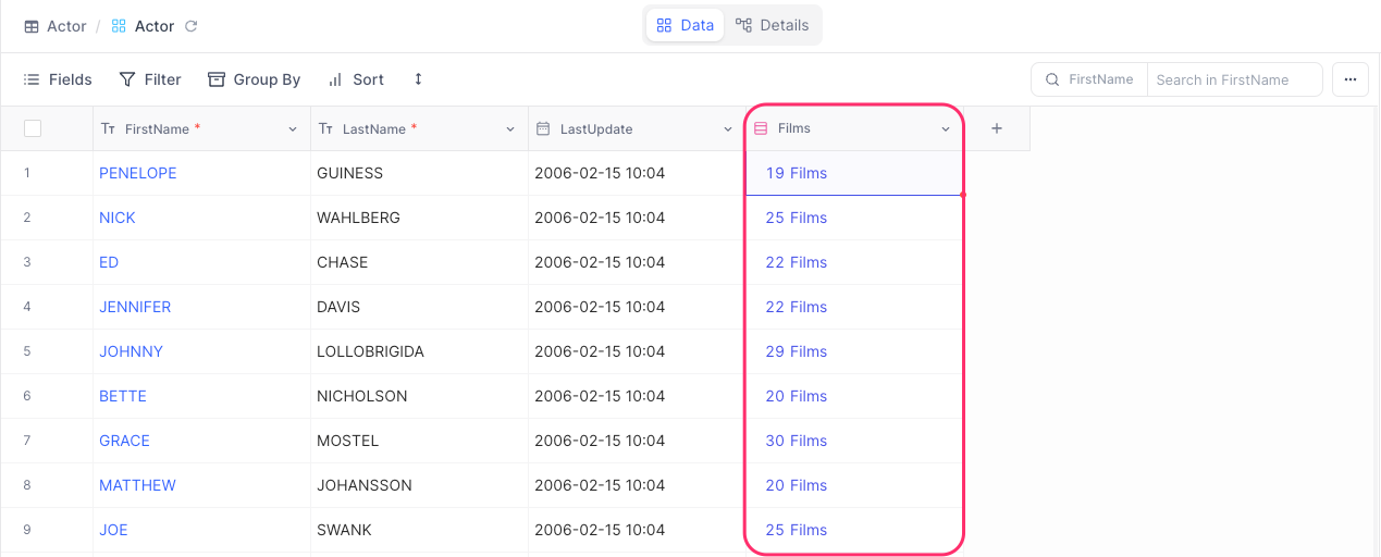- Cell Display: hiển thị số lượng liên kết của một bản ghi đến bảng liên quan