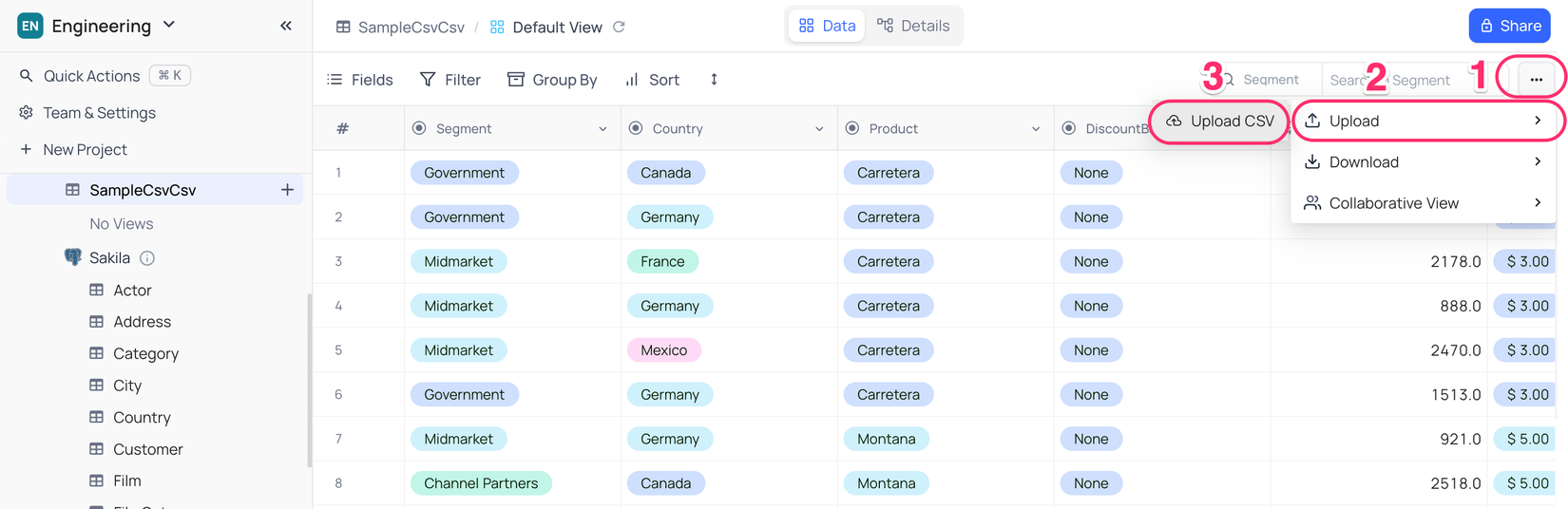 Sau khi tạo bảng rồi thì cũng phải thêm dữ liệu vào bảng. Mỗi một điểm dữ liệu gọi là bản ghi. Có 2 cách để thêm: bằng tay hoặc import từ CSV/Excel.