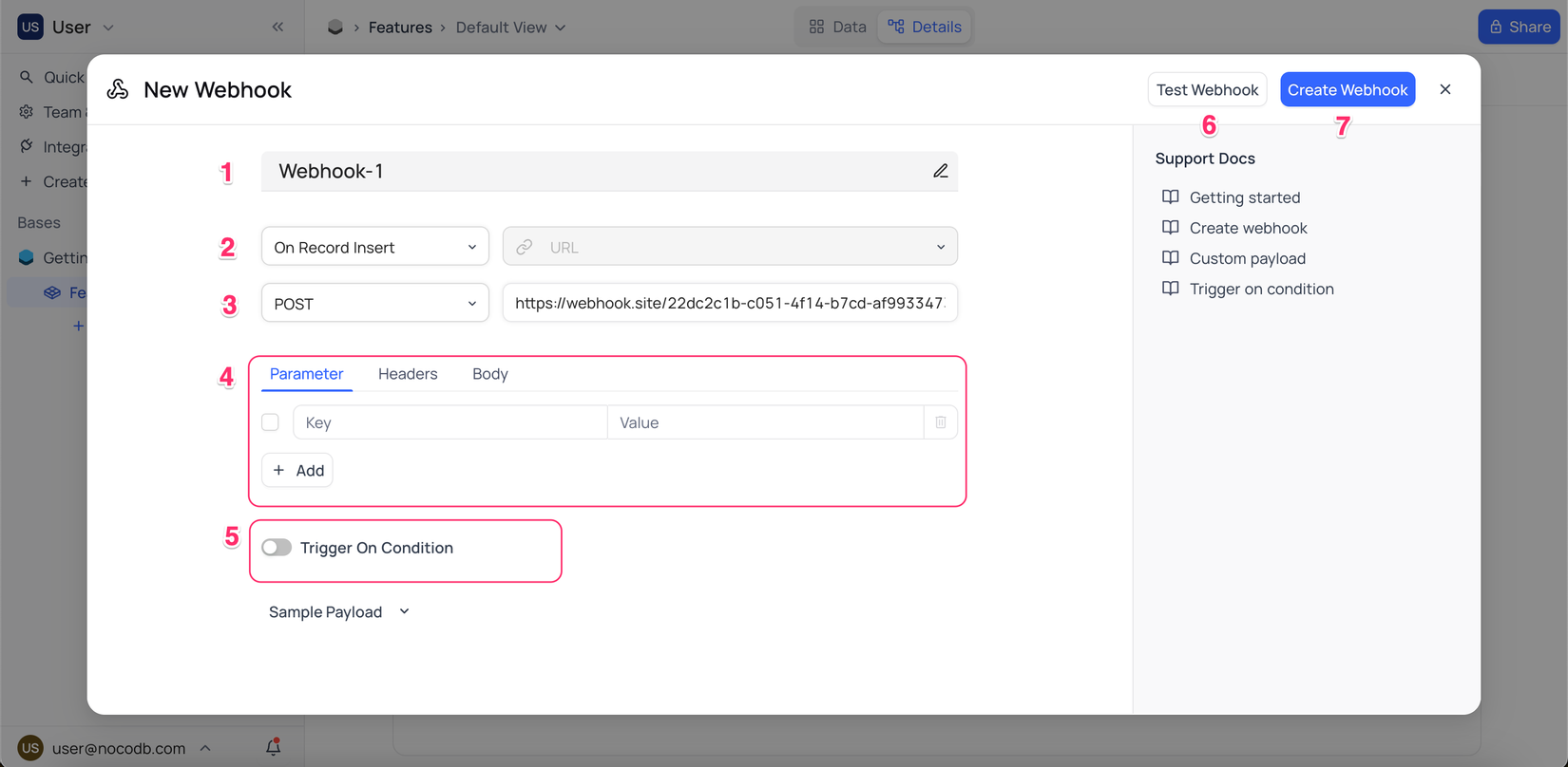 - Condition: chỉ những bản ghi đáp ứng điều kiện đề ra mới kích hoạt webhook (optional).