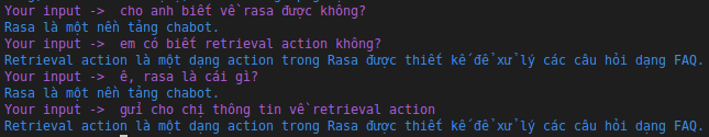- Retrieval action là một dạng action trong Rasa được thiết kế để xử lý các câu hỏi dạng FAQ.