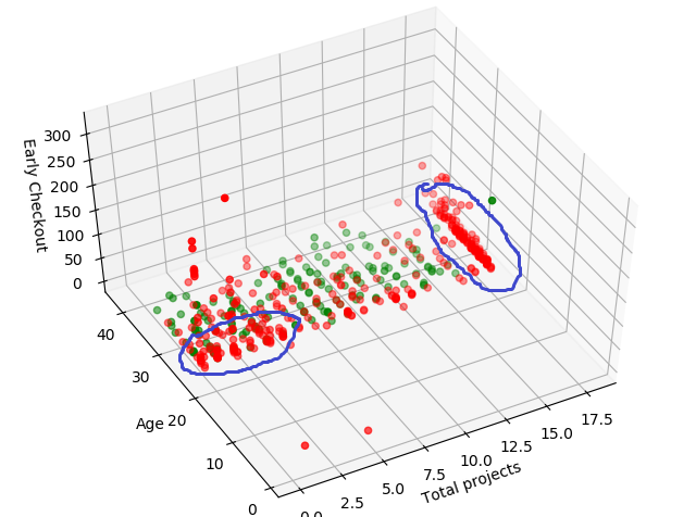 Tuy nhiên, câu hỏi cuối cùng và quan trọng nhất là Những yếu tố này ảnh hưởng như thế nào?. Visualize dữ liệu ban đầu trên không gian 3 trục (total projects, age và early check_out) ta sẽ tìm thấy những câu trả lời thú vị cho câu hỏi này
