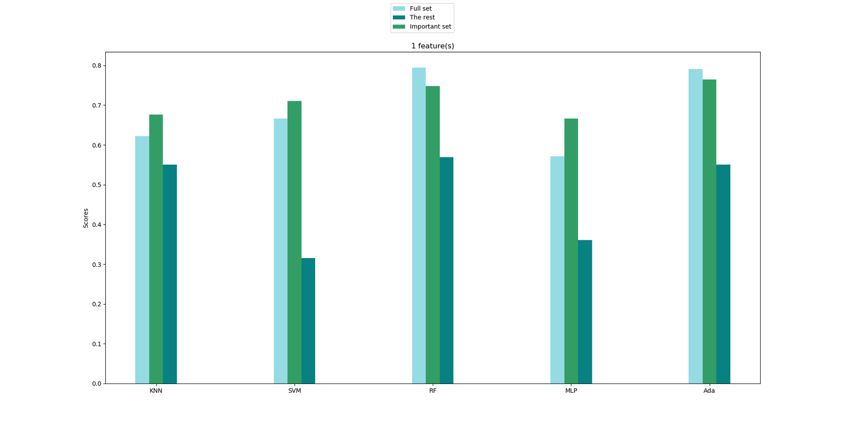 Okay, khá ổn. Tuy nhiên câu hỏi lúc này là Bảng xếp hạng kia có đáng tin cậy?. Để trả lời cho câu hỏi này, ta sẽ verify kết quả bằng cách chọn ra top-k đặc trưng quan trọng nhất (ở đây mình chọn k = 3) và tách tập dữ liệu ban đầu thành 2 tập mới: Important set gồm 3 đặc trưng quan trọng nhất (total projects, age, check_out) và The rest gồm 6 đặc trưng "không quan trọng" còn lại. Cùng với tập dữ liệu ban đầu (Full set), ta tiến hành train 3 tập dữ liệu này trên các thuật toán phân loại khác nhau. Nếu độ chính xác của các thuật toán trên "Important set" xấp xỉ trên "Full set" và độ chính xác trên "The rest" thấp hơn hẳn 2 tập còn lại thì có thể kết luận kết quả trên đáng tin cậy!