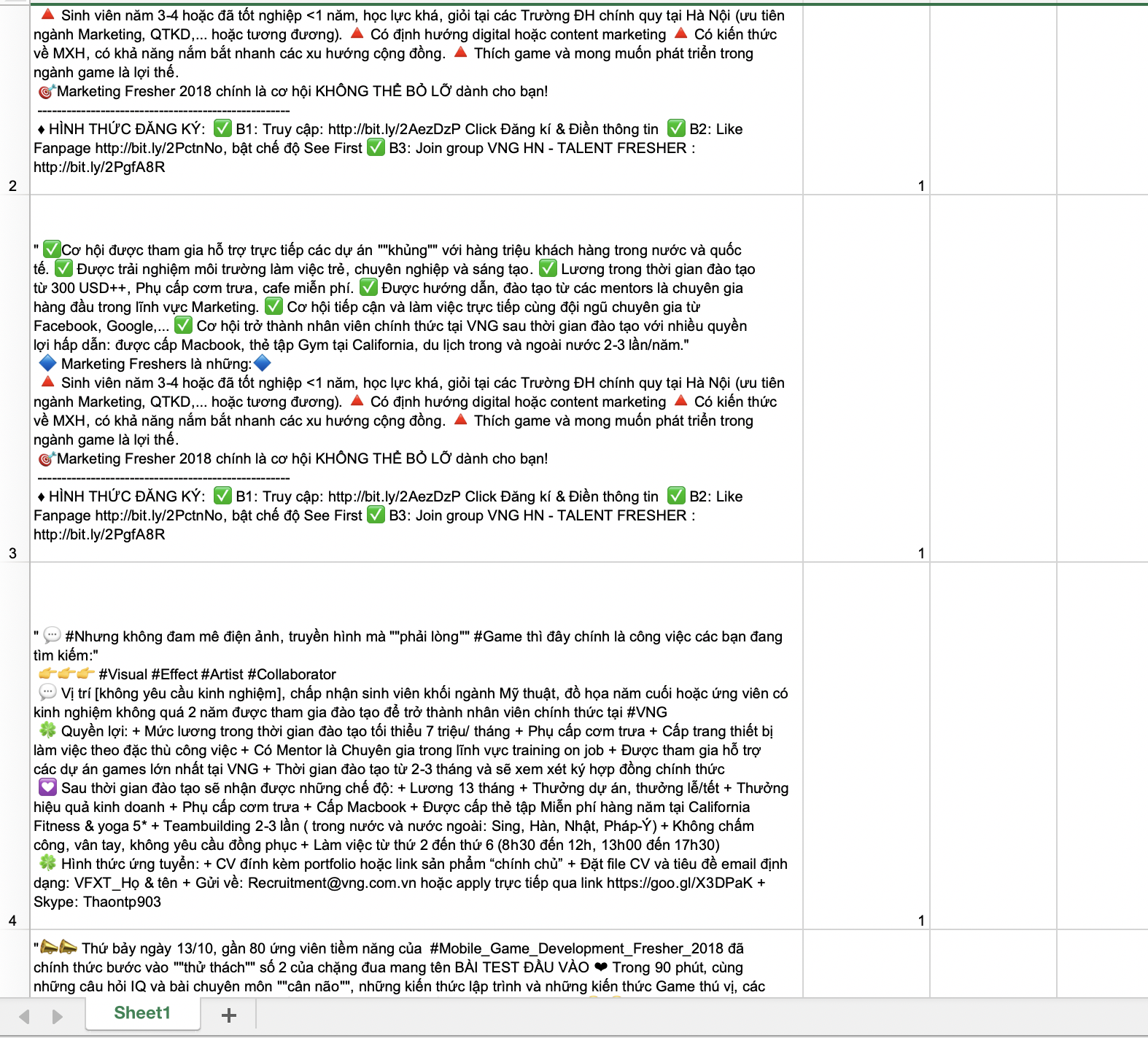 Mình cố gắng và tổng hợp ra được 219 email, trong đó có 114 email là spam còn lại là email bình thường rồi lưu vào 1 file Excel như dưới đây kèm label (1 là spam, 0 là non-spam)