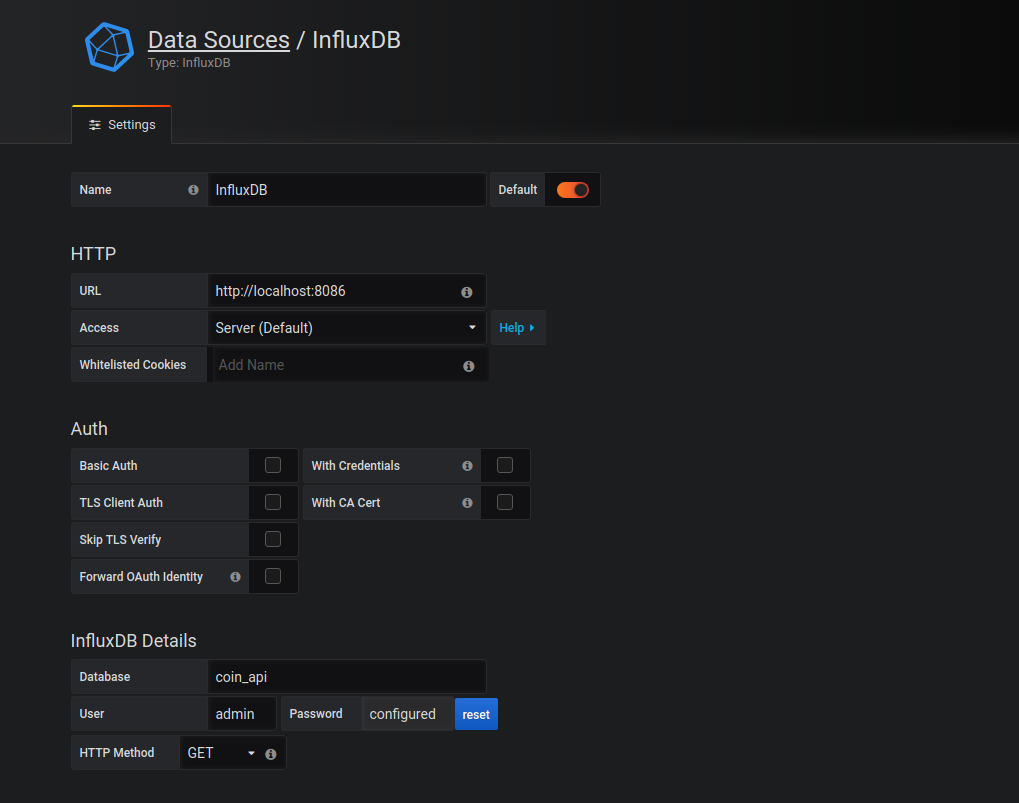 Trên sidebar phía bên trái màn hình Home các bạn có thể chọn Configuration (Biểu tượng bánh răng ). Như mở đầu mình đã trình bày, dữ liệu lần này là dữ liệu thời gian thực và được lưu trữ bởi InfluxDB, do đó mình sẽ sử dụng Datasource là InfluxDB, để có thể thực hiện bước này các bạn cần có chút kiến thức về InfluxDB, những ai chưa có kiến thức về phần này thì có thể overview qua bài viết trước đó của mình :