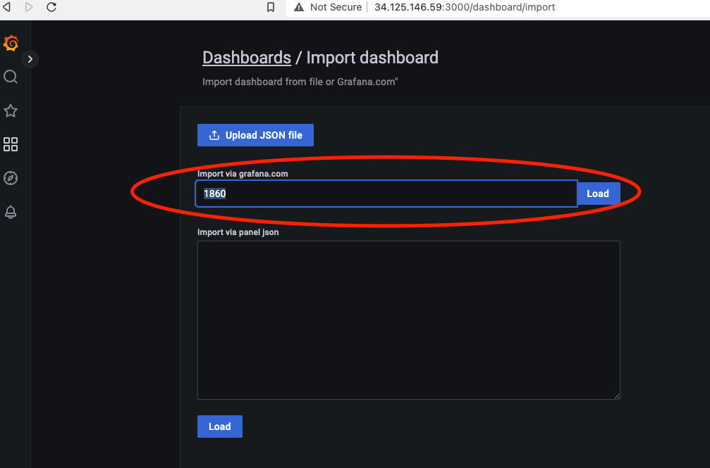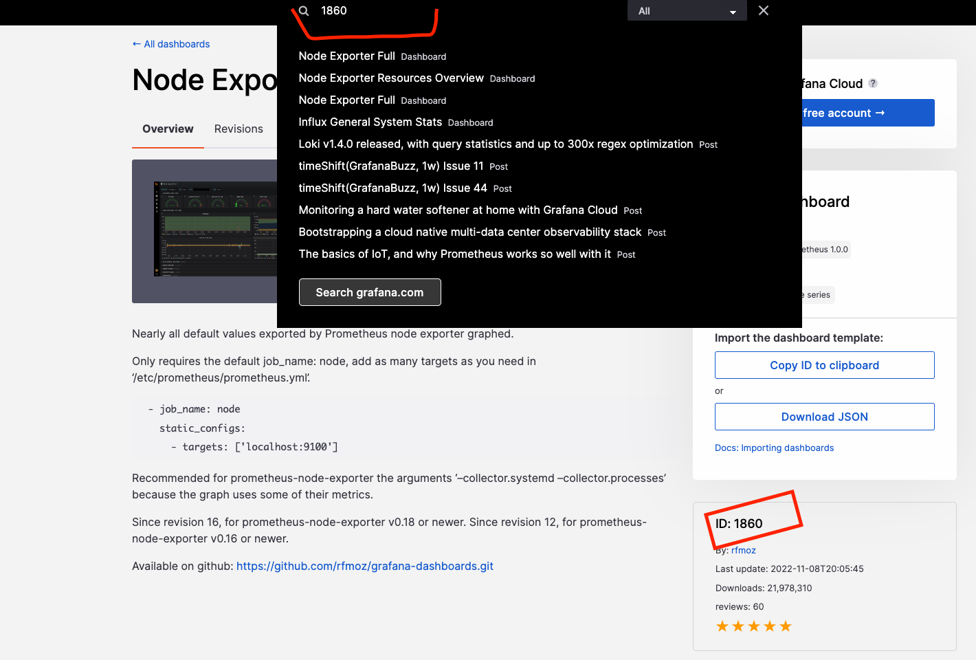 - Tiếp đến các bạn load mẫu dasdboard ID hoặc dạng file json từ trang chủ của grafana ở đây. Muốn ID nào bỏ vào ô tìm kiếm nhoé.