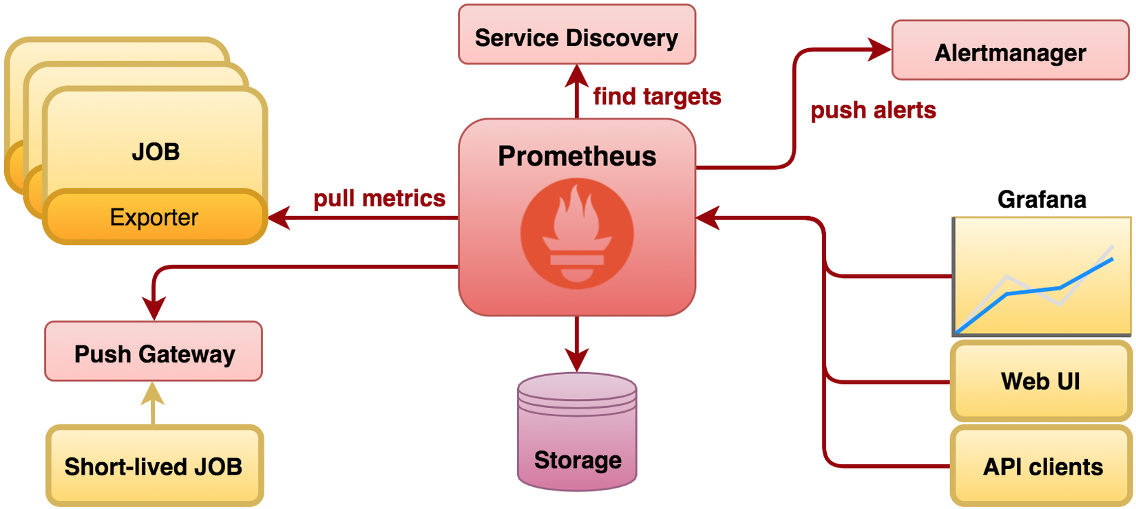 - Prometheus sẽ thực hiện quá trình kéo (pull) các thông số/số liệu (metric) từ các job (exporter).