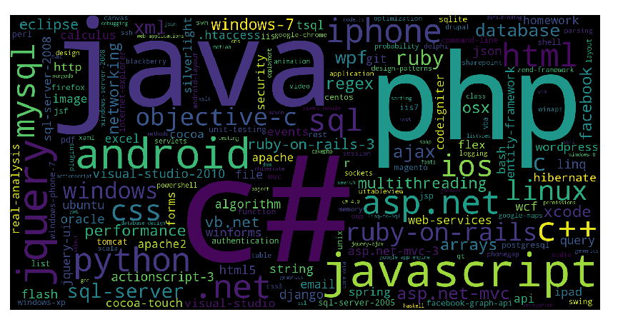 Dựa vào word map ở hình 7 chúng ta có thể nhận thấy có một số tags phổ biến (tần suất xuất hiện nhiều nhất) như: "c#", "java", "php", "android", "javascript", "jquery", "C++"