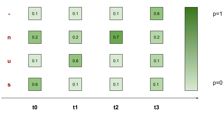 3. Transcription layer: Thành phần cuối cùng là transcription layer. Nó sử dụng Connectionist temporal classification(CTC) để dự đoán đầu ra cho từng time step. Chúng ta sẽ cùng lấy ra một ví dụ để hiểu rõ hơn về cách sử dụng CTC loss.