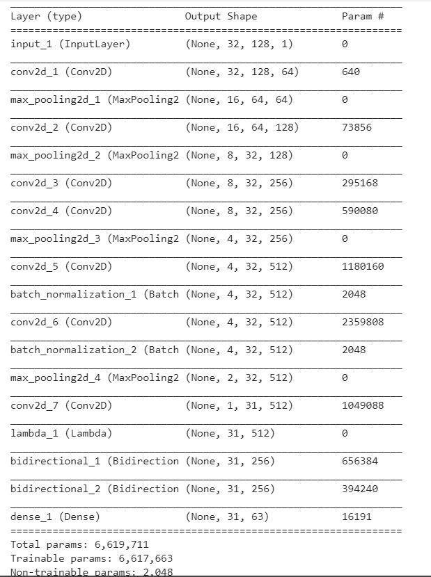 6.  Sử dụng  2 Bidirectional LSTM layers với mỗi layer là 128 units. RNN layer có đầu ra với kích thước (batch_size, 31, 63). Số 63 ở đây là tổng các lớp đầu ra bao gồm cả kí tự trống.